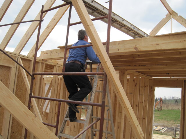 Jason and Noel installing stove pipe on one of the coldest days of the year.  They had to build scaffolding first.